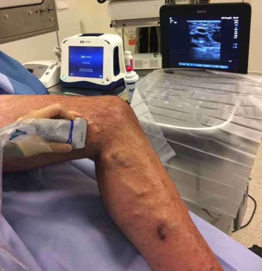 In patients presenting with varicose veins, a bedside venous duplex is performed. This requires the application of ultrasound gel, similar to a pregnancy scan, and passage of the ultrasound probe over the varicose veins to identify venous anatomy particularly the size of the vein and whether it is incompetent – leaky. This is a painless examination.