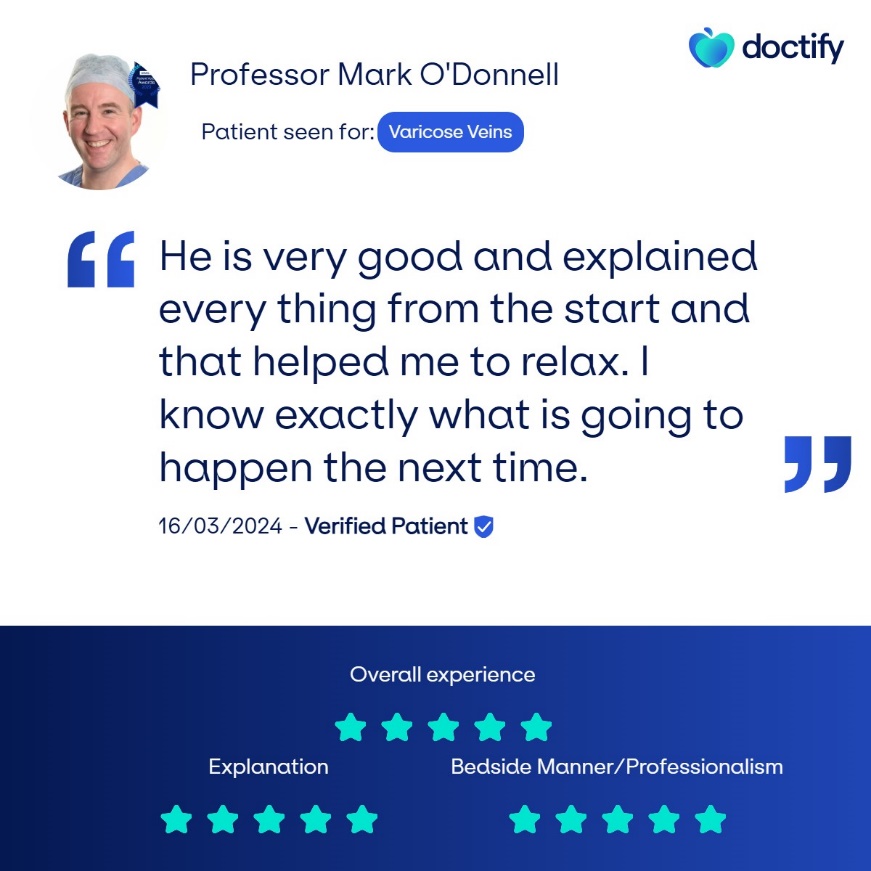 Professor O’Donnell Vascular Surgery continues to provide high-quality personalised treatment to all his patients. Outstanding Patient Feedback in 2025 placed Professor O’Donnell in the top 10% of UK healthcare professionals on Doctify.