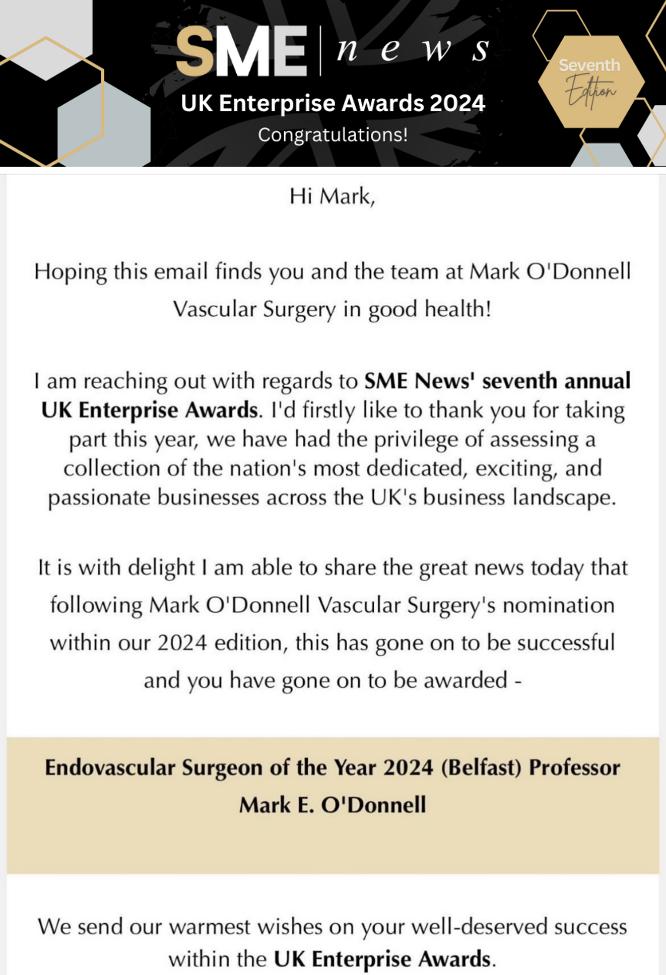 Professor Mark O'Donnell – Winner of Endovascular Surgeon of the Year 2024 (Belfast) at the SME News 7th Annual UK Enterprise Awards
