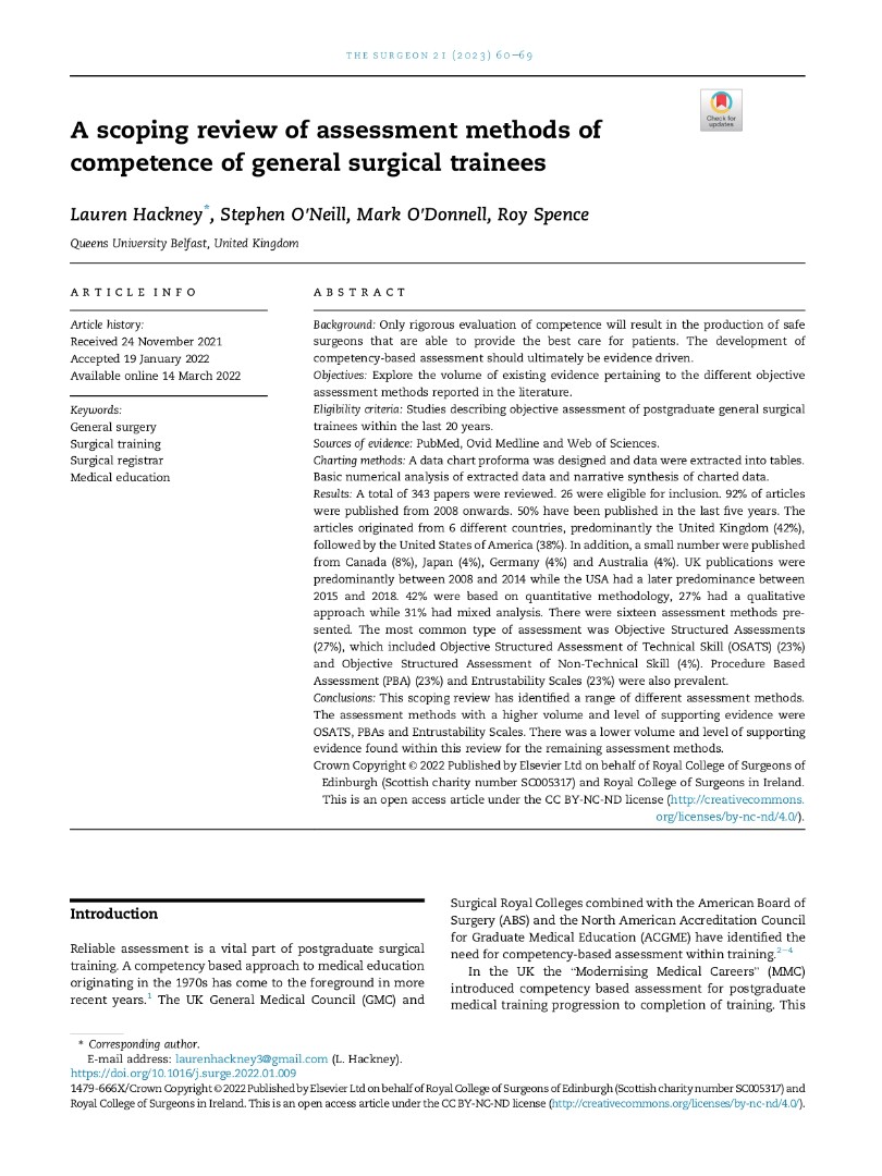 Written submission of theses culminated in the award of a Medical Doctorate in 2008 evaluating ischaemia-reperfusion in patients with peripheral arterial disease and a Master of Medical Science in Education for the Healthcare Professions in 2009 evaluating career choice in Northern Ireland Foundation Doctors.